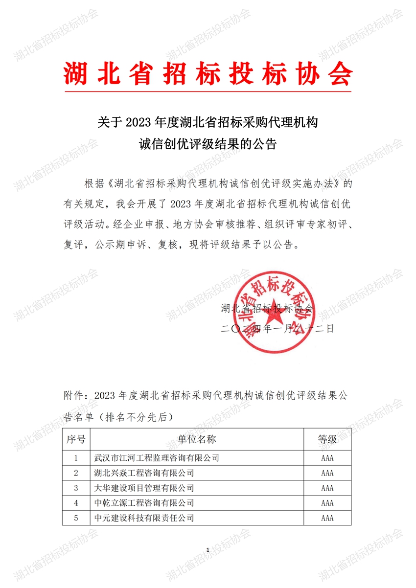 關(guān)于2023年度湖北省招標(biāo)采購代理機(jī)構(gòu)誠信創(chuàng)優(yōu)評級結(jié)果的公告